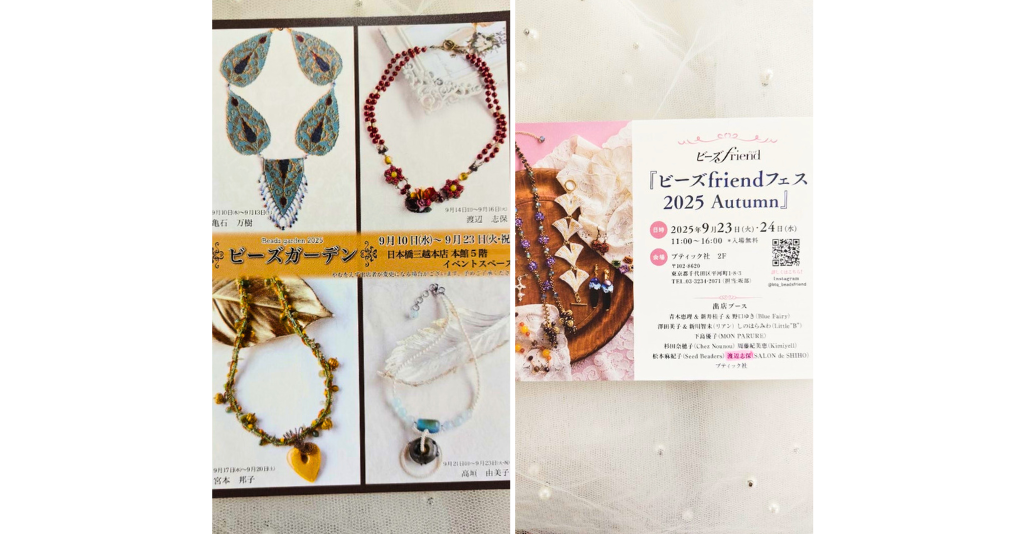 ꕥ2025年9月のイベント・お教室・工房営業日のご案内です 【お教室】✦東松山教室|9月は営業日にご予約で承ります。✦渋谷教室|9月2日(火)、27日(土) 【9月以降イベント】✦9/14〜16>日本橋三越・ビーズガーデン|✦9/23〜24>ビーズFRIENDフェス2025|✦9/29〜10/2>新宿西口・BPAハンドメイドマルシェ ⏩🔗工房営業日、9月以降のイベントその他詳細はリンク先ページをご覧くださいませ。...